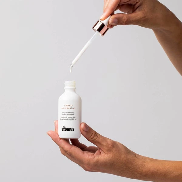 dr brandt LIQUID SUN SHIELD™ SPF 50 is a lightweight, 100% mineral sunscreen with broad-spectrum UVA/UVB SPF50, HEV/Blue Light, infrared and pollution protection, promotes radiance and more youthful-looking skin, protects against further discoloration, damage and photoaging.