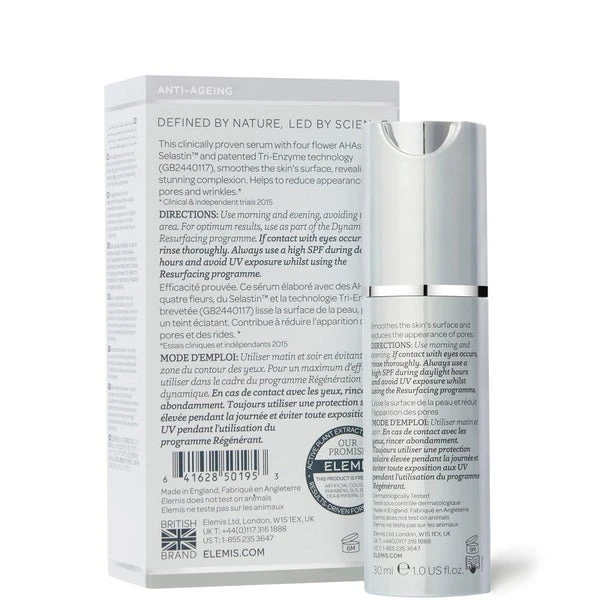 Clinically proven to improve the complexion, the skin-smoothing formula combines resurfacing technology with four plant Alpha Hydroxy Acids to gently dissolve dead skin cells on the surface and boost cell renewal. Its dose of Selastin⢠(an ingredient derived from marine plants) targets enlarged pores, whilst Amino Acids and encapsulated Vitamin C expertly tone, smooth and brighten skin’s surface.