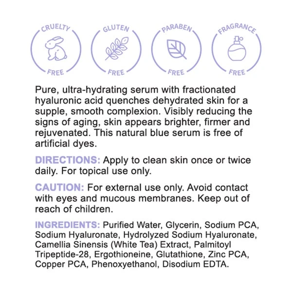 Pure, ultra-hydrating serum quenches dehydrated skin for a supple, smooth complexion and all day moisture retention. Visibly reducing the signs of aging with a nourishing blend of antioxidants and humectants, skin appears brighter, firmer and rejuvenated.